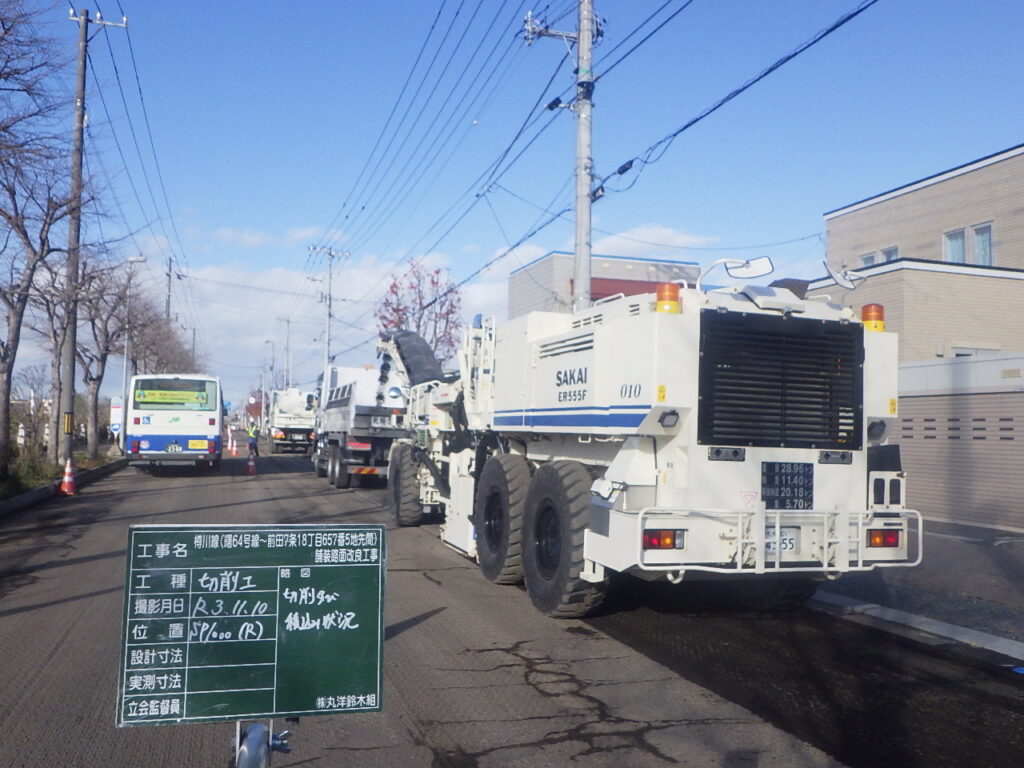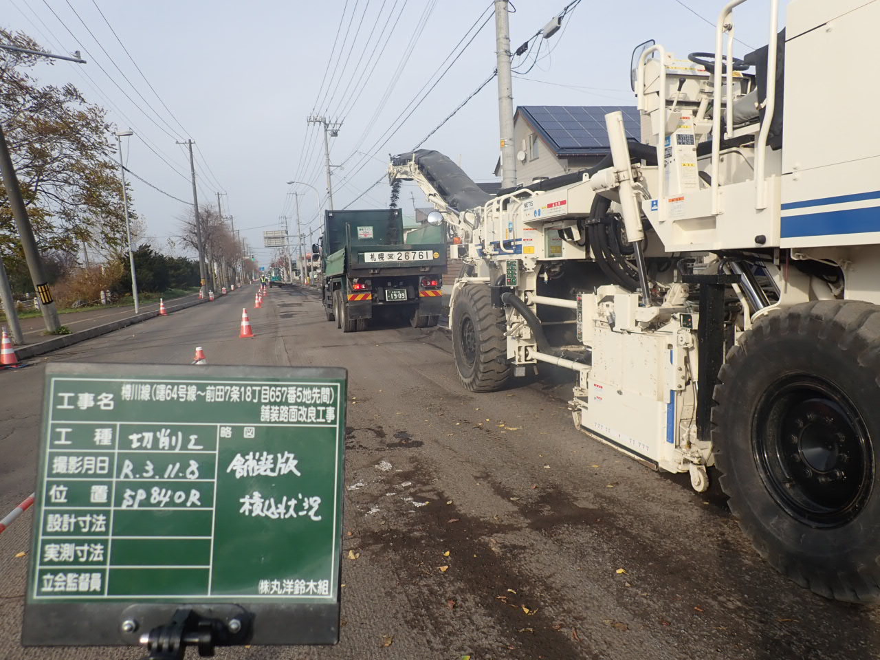 最初に現在の道路の高さを測量します。レベルなどの測量機器を使用して道路の高さや勾配を確認し、新しく舗装する際の仕上がり高さを計画します。 - 舗装切削施工