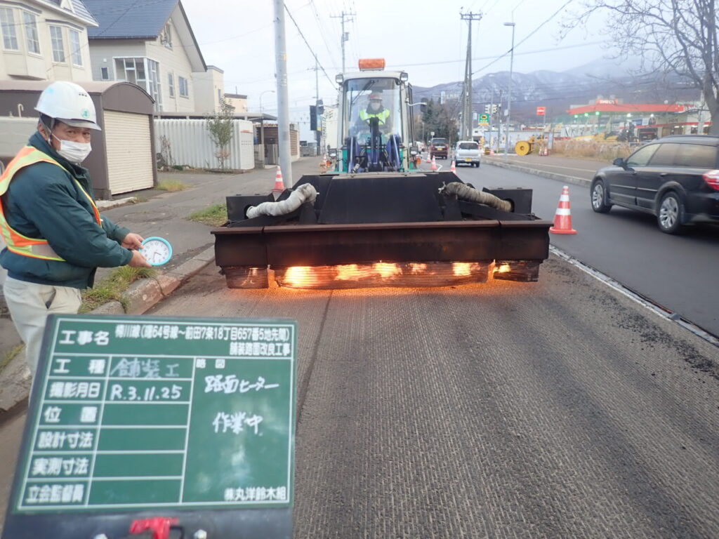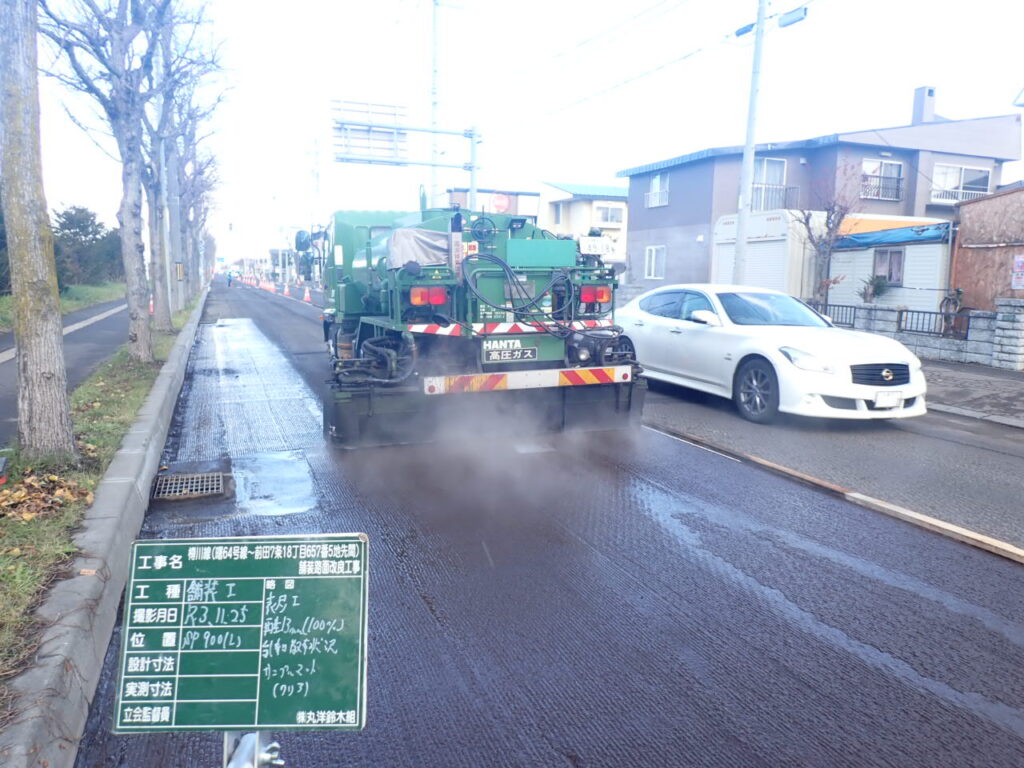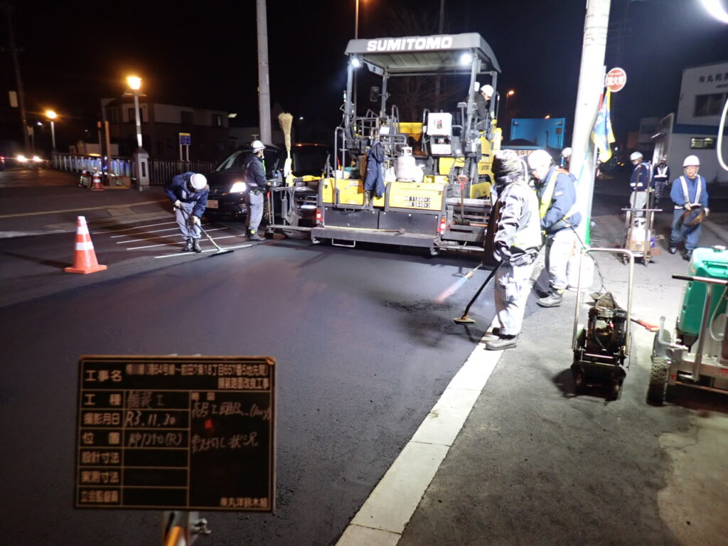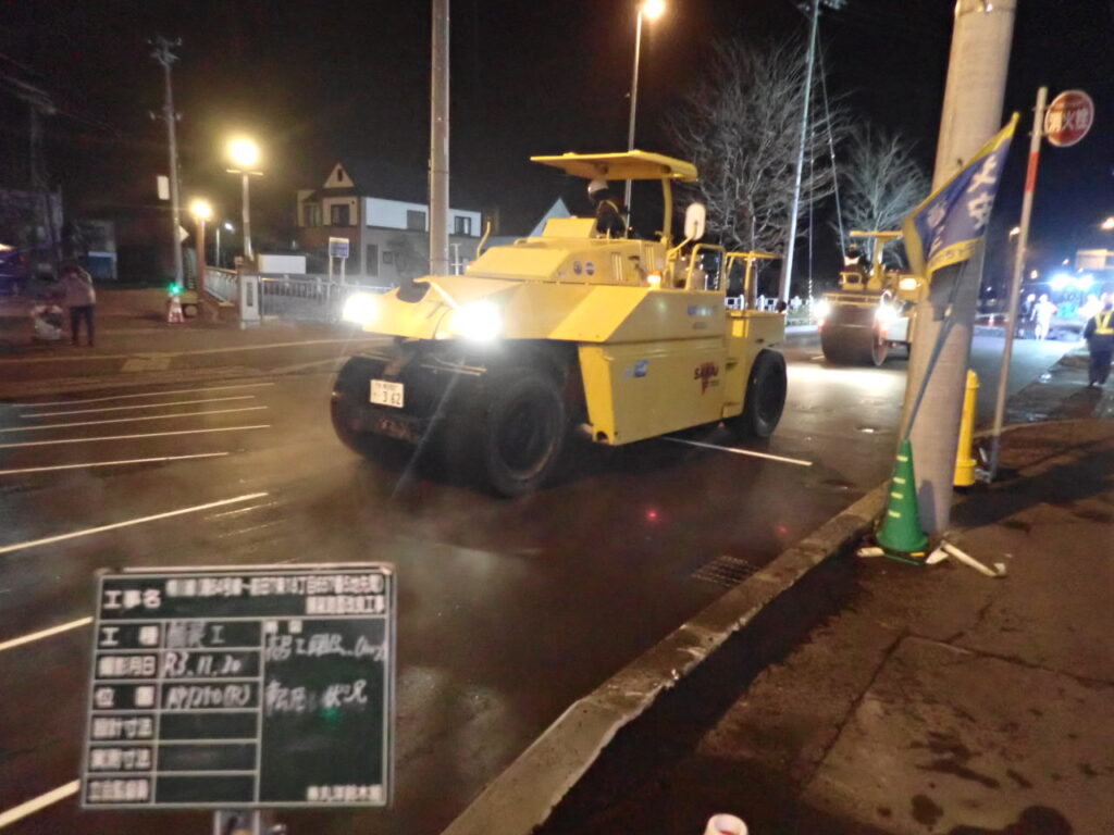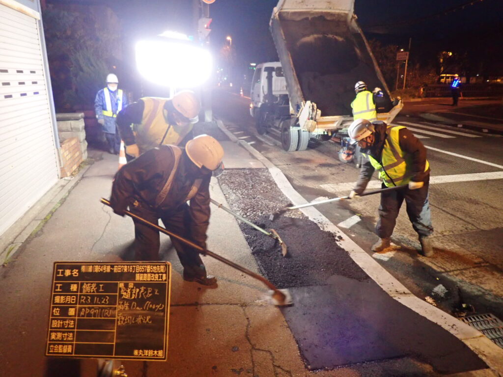 そのため、舗設作業ではアスファルトの温度管理や転圧作業のタイミングなどを適切に行うことが重要になります。また工事中は交通規制が比較的広範囲になるため近隣の施設や住民の方々に協力してもらうため、頻繁に工事工程の説明を行いました。